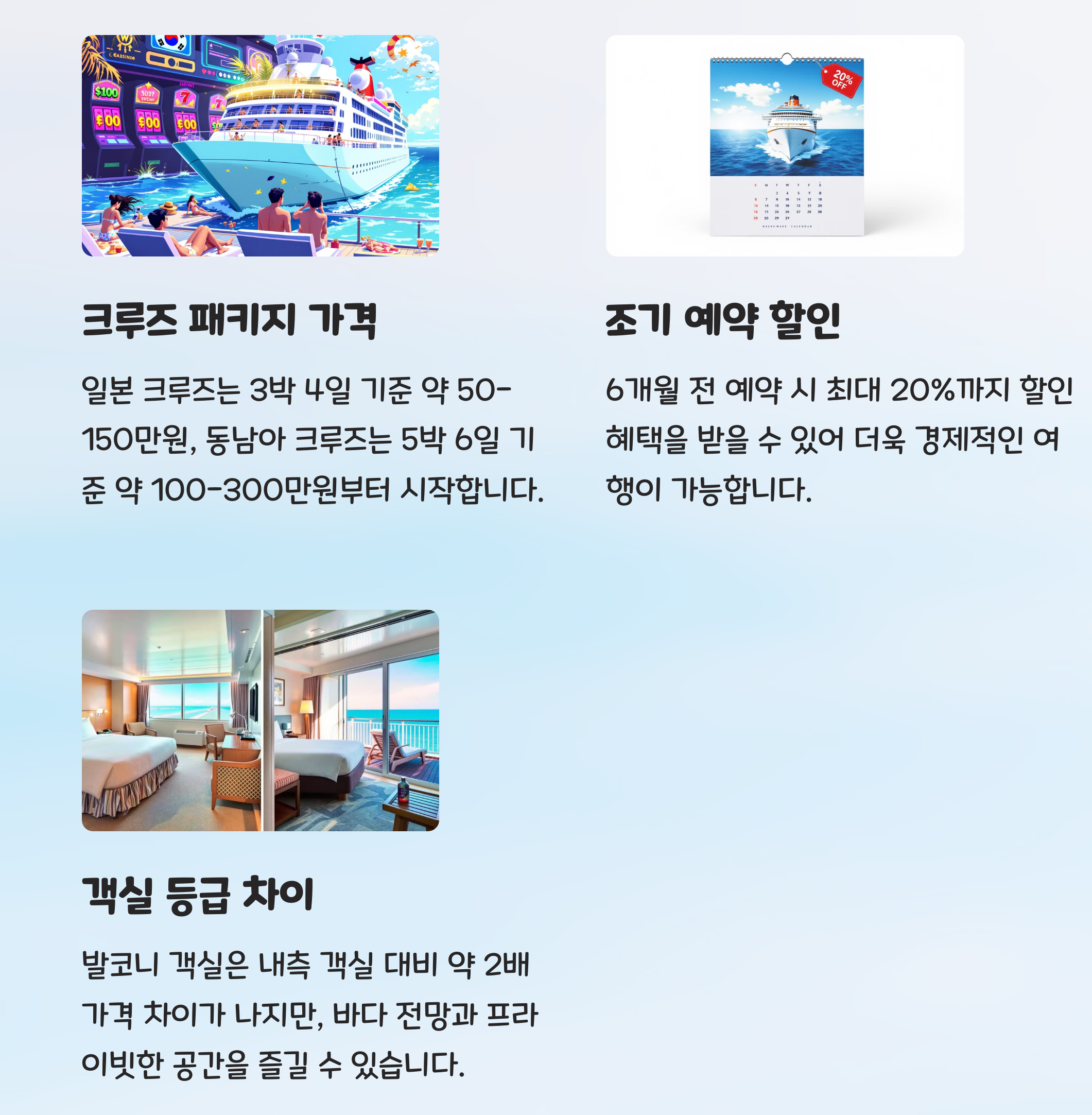 - 최적의 예약 시기 : 크루즈 여행은 **조기 예약할수록 더 저렴**해요! 얼리버드 프로모션이나 시즌 오프 할인을 적극 활용하세요.